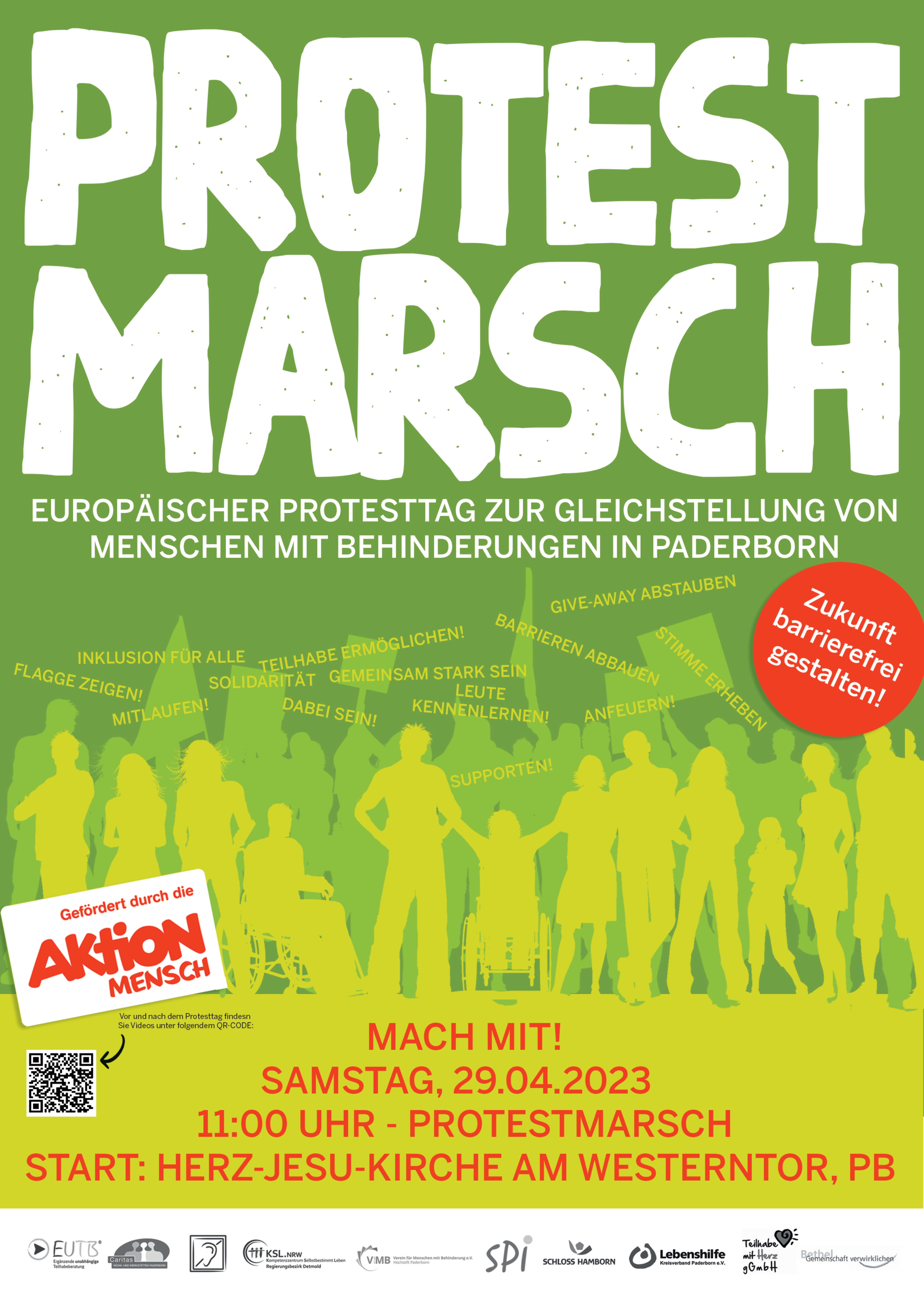 Anlässlich des europäischen Protesttags zur Gleichstellung von Menschen mit Behinderungen findet am 29.4.2023 in Paderborn ein Protestmarsch mit diversen Aktionen und Überraschungen statt. Start ist um 11 Uhr an der Herz-Jesu-Kirche am Westerntor in Paderborn.